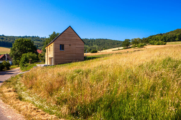 Der Neubau des Einfamilienhauses steht auf einem hanglagigen Grundstück und ist nach Südwesten orientiert. Zur Bestandsstruktur des Straßendorfes fügt sich der Baukörper entlang der Straße ein und wird aus Westen erschlossen. Das zweigeschossige Wohnhaus mit Satteldach wurde aus der ortstypischen Bauweise abgeleitet und in hybrider Bauweise realisiert. Der Baukörper wird von einer Holzschalung umhüllt; das Dach mit Solardachziegeln gedeckt. Das Gebäude erreicht die Effizienzhaus 55 EE-Klasse.