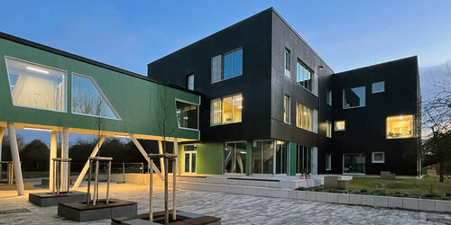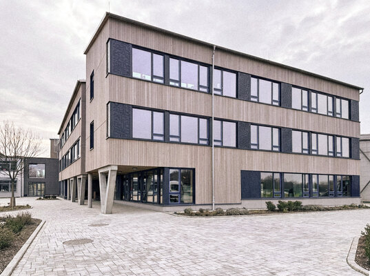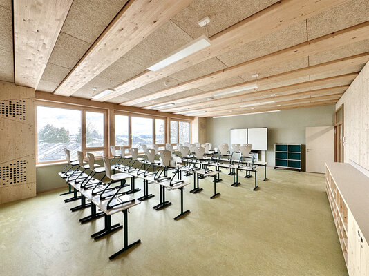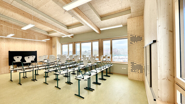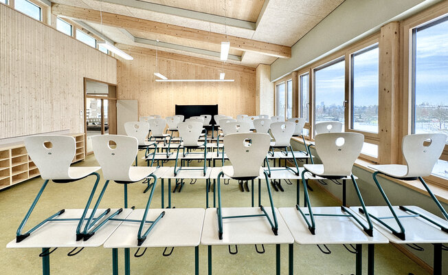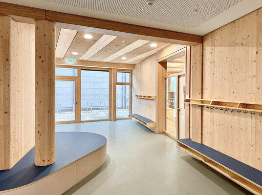 Der 2026 fertiggestellte Neubau der dreizügigen Grund- schule bildet den ersten Bauabschnitt der Neuordnung des Schulcampus. Der dreigeschossige Bau wurde konsequent als konstruktiver Holzbau realisiert. Jahrgangscluster mit offenen Lernfluren, differenzierten Rückzugsbereichen und viel Tageslicht unterstützen moderne pädagogische Konzepte. Die warme Materialität schafft eine gemeinschaftliche Atmosphäre – ein zukunftsfähiger kommunaler Bildungsbau.