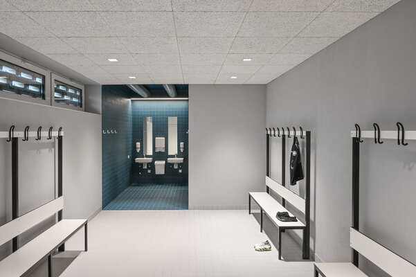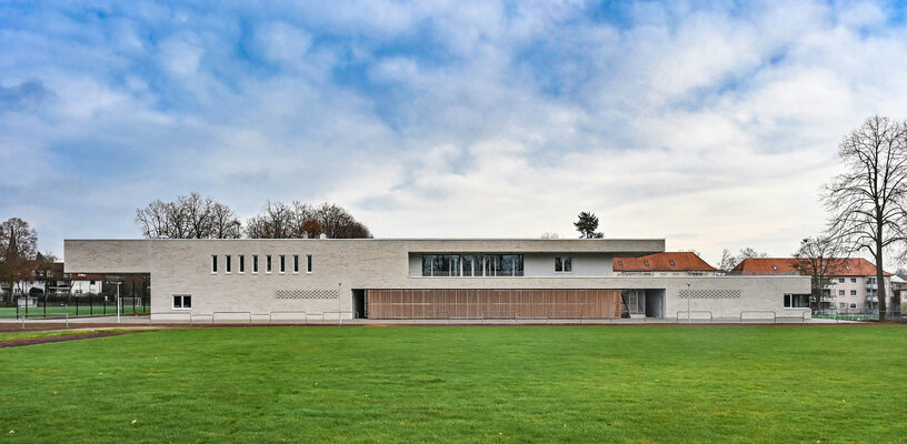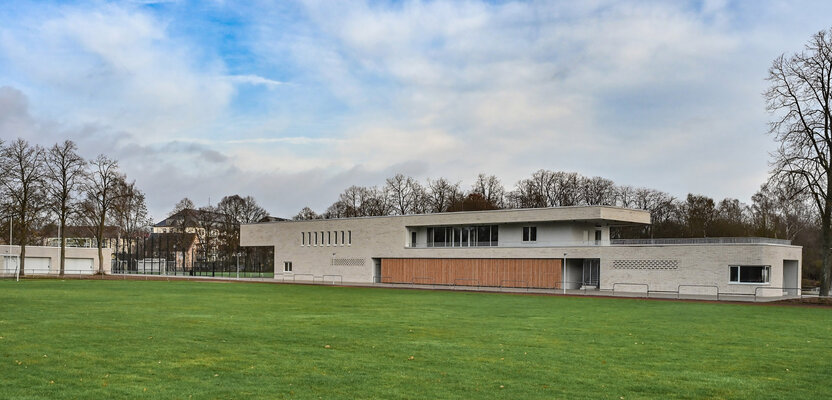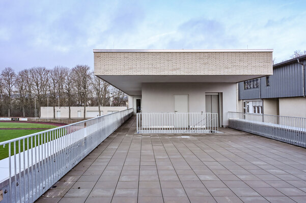 Mit dem inklusiven Sportzentrum ist eine von allen Men-schen gleichermaßen nutzbare Sportstätte entstanden. Zwei neue Gebäude sowie ein neuer Kunstrasenplatz machen das bestehende Areal zukunftsfähig. Das zweigeschossige Hauptgebäude beherbergt Umkleiden, Sanitäranlagen und Vereinsräume. Von der großzügigen Dachterrasse aus sind die vielfältigen Sportanlagen für Fußball, Tennis und Leichtathletik zu überblicken. Geräte und Trainingsmaterialien finden im eingeschossigen Lagergebäude Platz.