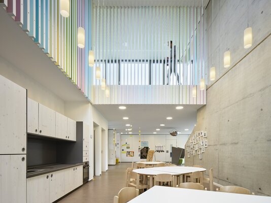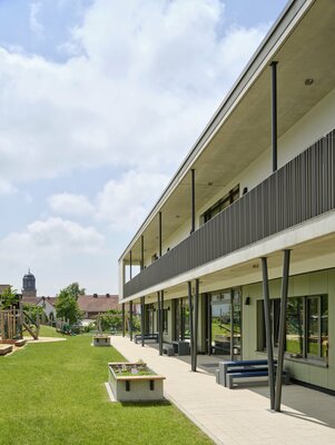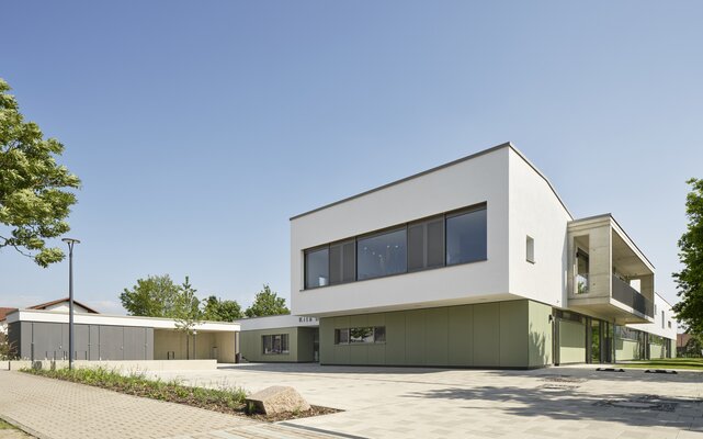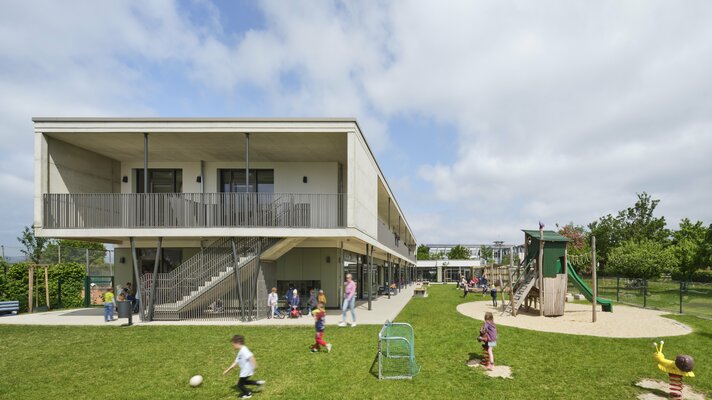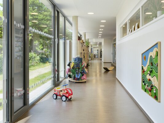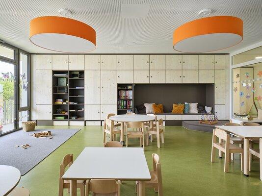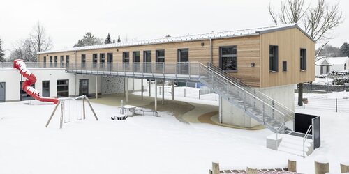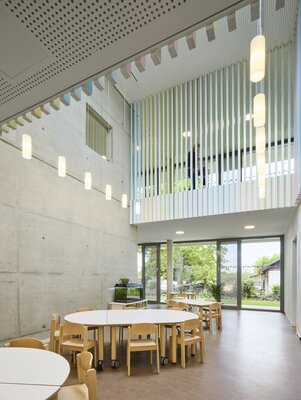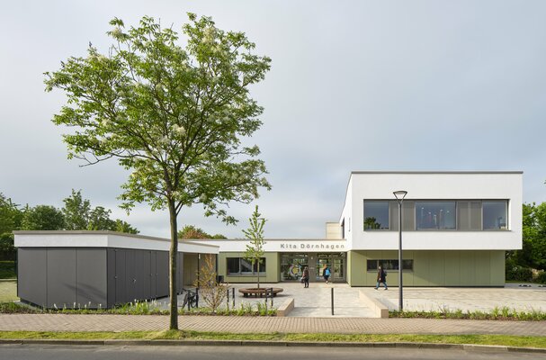 Der Neubau ist als ortstypisches Gebäudeensemble konzipiert. Der Entwurf reagiert auf das schmale und tiefe Grundstück mit einem langgestreckten Baukörper, der einen Vorplatz und einen den Gruppen vorgelagerten Freiraum ermöglicht. Ein zweigeschossiger Raum mit Galerie bildet das Zentrum der Kita, um das sich verschiedene Funktionsbereiche gruppieren. Die Fassadenmaterialien des Massivbaus betonen das additive Entwurfsprinzip.