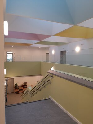 Die fünfzügige Kindertagesstätte mit Krippen-Bereich wurde in Massivbauweise errichtet. Die Funktionen des solitären Baukörpers gliedern sich über zwei Ebenen um eine zentrale, zweigeschossige Halle, als zentrales Erschließungs-Element. Die zentrale Halle wird über Dachflächenfenster belichtet. Ein umlaufender Gang im Obergeschoss mit gestaltprägender halbdurchlässiger Holzlamellenfassade gewährleistet für die Gruppenräume im Obergeschoss zusätzlich die Erschließung der Freianlagen.