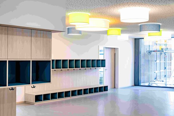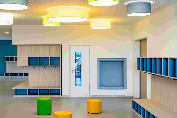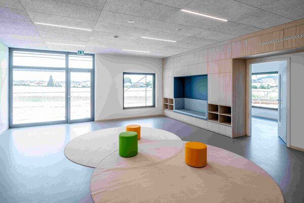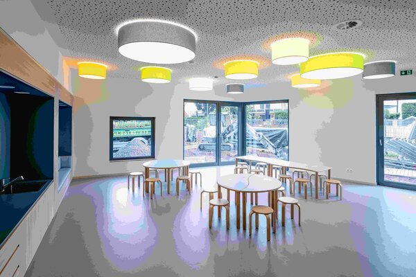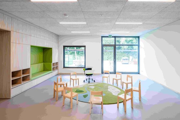 Als zunächst eingeschossige, fünfzügige Kita geplant und genehmigt, wurde das Projekt im Planungsverlauf um ein Obergeschoss mit geförderten 13 Wohnungen ergänzt. Das Raumprogramm der Kita umfasst, u.a. einen separierten U3-Betreuungsbereich sowie ein Kinderrestaurant mit ange-gliederter Vollküche. Die vorgegebene Tragwerksstruktur des Erdgeschosses ermöglicht im Obergeschoss großzügige Gemeinschafts- und Begegnungsflächen.