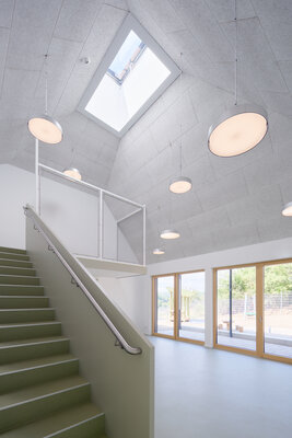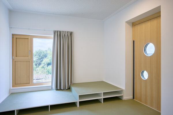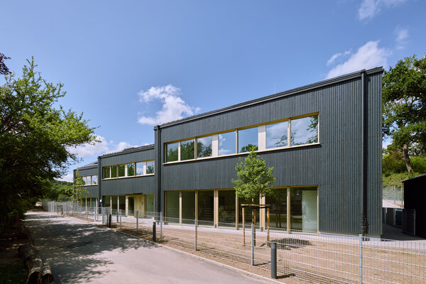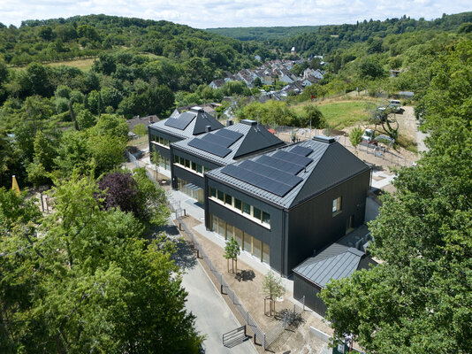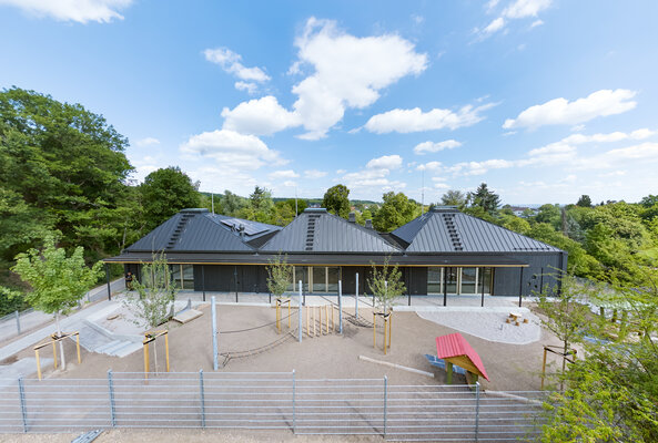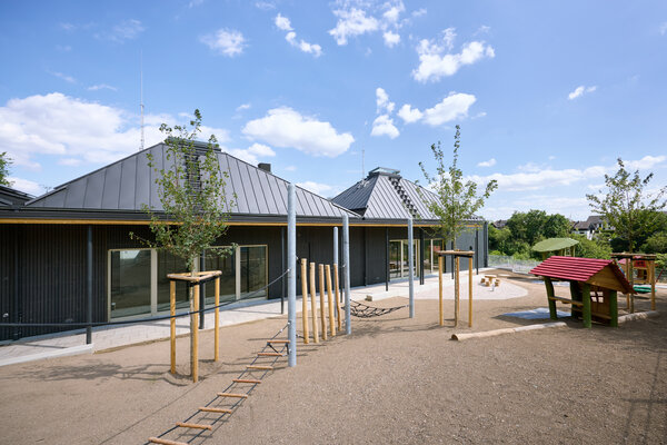 Drei dunkle Dächer prägen den Baukörper der Kita St. Georg. Der zweigeschossige Holzhybrid-Neubau mit schwarzer Holzlamellenfassade verbindet zwei Geländeebenen. Der Zugang erfolgt über die untere Ebene. Hier liegen auch der Mehrzweckraum, die Küche und die Verwaltung. Im Obergeschoss öffnen sich unter den drei Dächern Erlebnisräume für kleine Entdecker. Die Gruppenräume orientieren sich zum höher gelegenen Spielgarten. Eine integrierte Photovoltaik-Anlage auf den Dächern sorgt für nachhaltigen Betrieb.