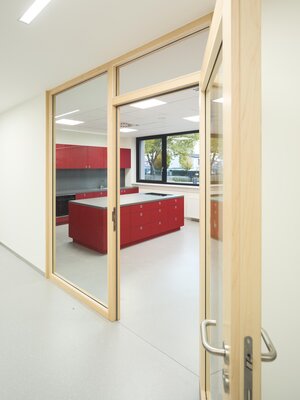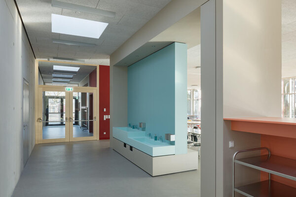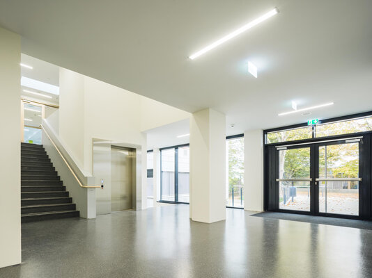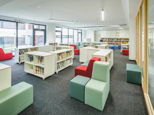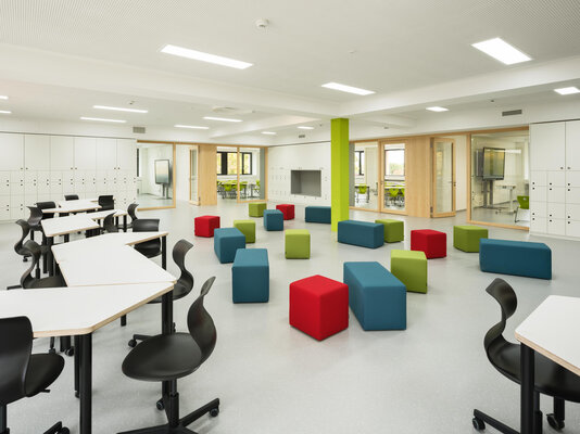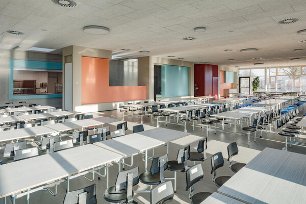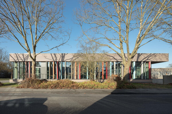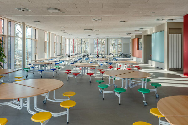 Das Schulgebäude von 1971 wurde entkernt und umfassend saniert und um einen Mensaneubau erweitert. Planungsaufgabe war, dass vorhandene, seinerzeit richtungsweisende Raumkonzept aus vier Jahrgangsclustern mit Lernzonen zu erhalten und sensibel zukunftsfähig auszubauen. Der Mensaneubau wurde in Holzhybridbauweise, vorelementiert errichtet und wird auch als Quartierszentrum genutzt. Der Bestandsbau wurde um Fachklassenräume erweitert, barrierefrei ausgebaut und energetisch ertüchtigt.