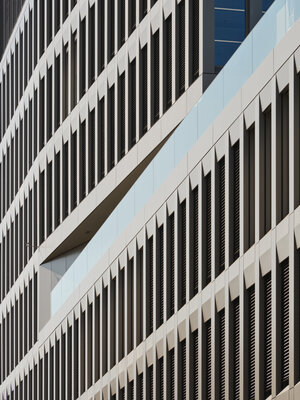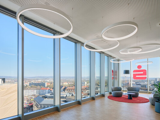 Der S-Finanz-Campus setzt einen städtebaulich markanten Hochpunkt in der Kasseler Innenstadt. Der Neuengeschosser ist in zwei Bauteile gegliedert und verbindet zeitgemäße Architektur mit klarer Struktur. Die vorgefertigte Fassade aus hellen Metallpaneelen bildet ein schillerndes, gegliedertes Netz, dessen Einschnitte besondere Nutzungen ablesbar machen und die eigenständige Architektursprache unterstreichen.