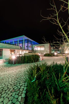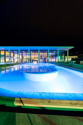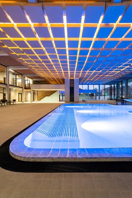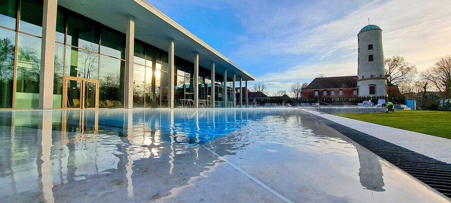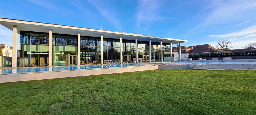 Das Thermalbad schließt mit seiner schlichten, doch erhabenen Architektur, unaufdringlich an das historische Jugendstil-Ensemble von Wilhelm Jost an.