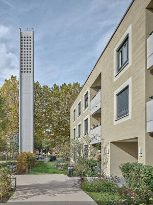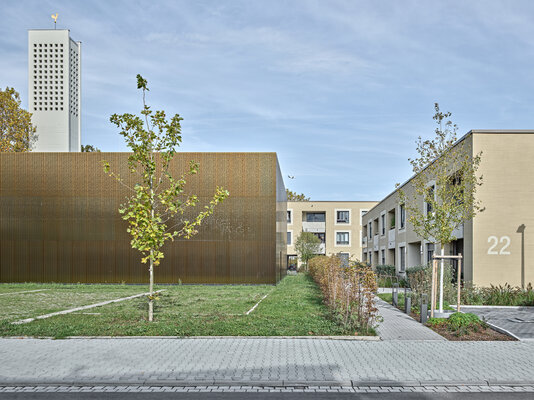 Nach Abbruch des Gemeindezentrums entsteht aus Kirche und Wohnbebauung ein Ensemble mit neuen räumlichen Identitäten, eine neue Mitte des sozialen Miteinanders. 24 Wohnungen teils als geförderte, teils als frei finanzierbare Maßnahme. Unterschiedlichen Wohnungsgrößen als ein bis vier Zimmerwohnungen nach den Förderrichtlinien des Landes Hessen. Differenziertes Farbkonzept zwischen Kirche und Wohnbebauung, die die Hierarchie zwischen Wohnbauten und Sakralbau unterstützen.