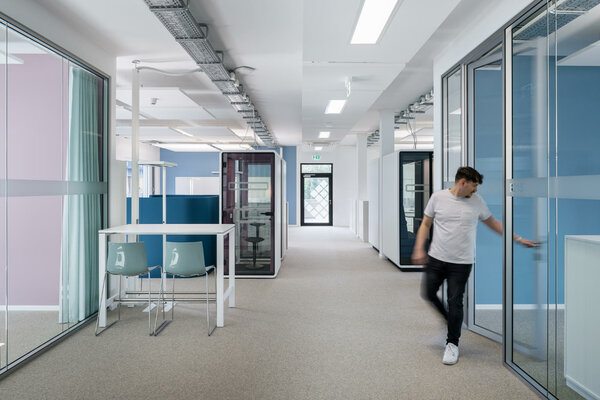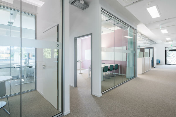 Temporäre Arbeitsräume in System-Modulbauweise. Die Pavillonanlage wurde als temporäre Erweiterung für die Verwaltung (Kreishaus Darmstadt-Dieburg) errichtet. Der L-förmige Bau schließt das bestehende Ensemble städtebaulich zur Straße hin ab und formuliert einen neuen Innenhof. Die reliefartige Fassade illustriert den modularen Aufbau des Gebäudes und ergänzt mit ihrer Farbigkeit zeitgemäß die Gestaltung der Bestandsgebäude. Der Baukörper beherbergt insgesamt sechs Großraum-Büroeinheiten.