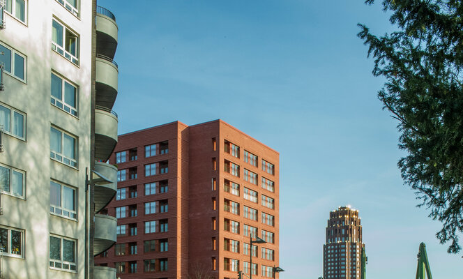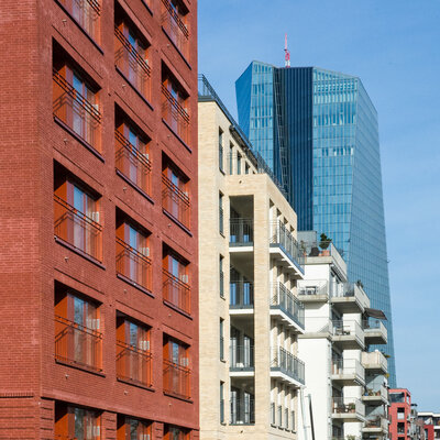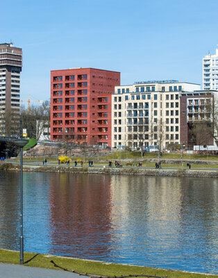 In prominenter Lage direkt am Mainufer realisierten Stefan Forster Architekten 28 Wohnungen und 70 Appartements. Das Projekt „Oskar“ gliedert sich in ein achtgeschossiges Wohngebäude und einen zehn-geschossigen Turm mit Boardinghaus. Zusammen mit dem gegen-überliegenden, revitalisierten Gebäude der ehemaligen Arbeitsagentur fungiert der rote Klinkerbau als Tor zum Ostend. Mit der aufwändigen, profilierten Fassade erinnert das Gebäude an städt-ische Architekturen aus früheren Zeiten.
