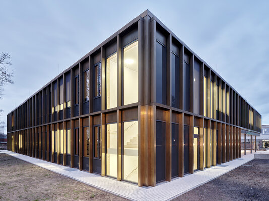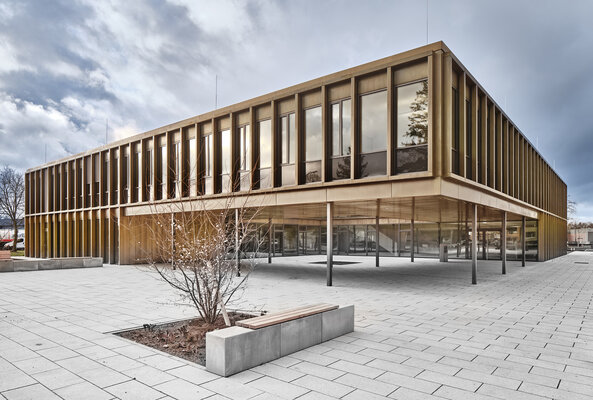 Das neue Rathaus der Gemeinde Hainburg positioniert sich als zweigeschossiger Solitär auf dem exponierten Eckgrundstück. Durch den Gebäudeunterschnitt am Vorplatz entsteht ein überdeckter Eingangsbereich, der in das Foyer hineinführt. Zwei Innenhöfe gliedern den Grundriss und ermöglichen eine natürliche Belichtung und Belüftung der inneren Räume und Flure. Die Fassade aus handwerklich verarbeiteten Bronzeblechen schützt die Holzkonstruktion und verleiht dem Rathaus seine signifikante Gestalt.