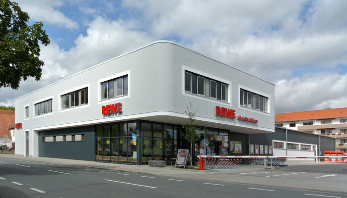 Mit der Stadtkernentwicklung Gustavsburgs entstand in exponierter Lage auch der neue REWE-Markt. Der zweigeschossige