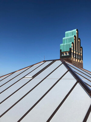 Die Mathildenhöhe ist ein weltweit einzigartiges architektonisches und städtebauliches Gesamtkunstwerk, das 2021 zum UNESCO-Welterbe ernannt wurde. Frisch saniert präsentiert sich nun das 1908 nach Plänen von Josef Maria Olbrich errichtete Ausstellungsgebäude: Ein neuartiger Außendämmputz, moderne Gläser, ein neues Café und ein nachhaltiges Energiekonzept, welches den historischen Wasserspeicher einbezieht – das und mehr umfasst die denkmalgerechte Sanierung.