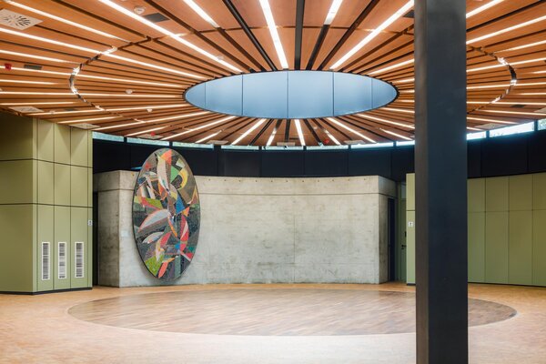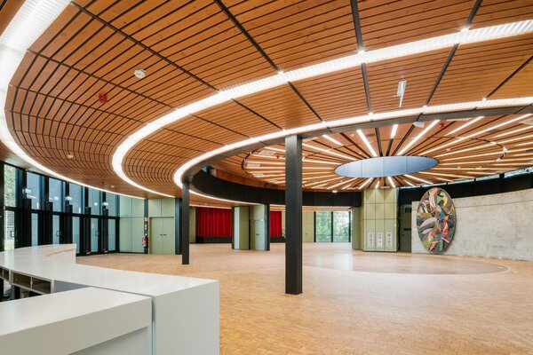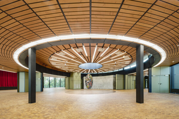 Die denkmalgeschützte Stadthalle wurde 1971 als Stahlskelettbau mit Aluminiumfassade errichtet. Das Gebäude betont in seiner radialen Gebäudestruktur den Aspekt der Gemeinschaft. Ausgehend vom zentralen Foyer entwickeln sich 6 schaltbare Versammlungsräume. Im Zuge der Sanierung wurde die Stadthalle brandschutztechnisch und energetisch ertüchtigt. Die bauzeitlichen Einbauten und die kräftige Farbgebung konnten erhalten werden und spiegeln die optimistische Atmosphäre der 70er Jahre wider.