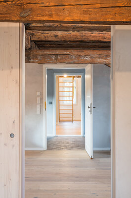 Das repräsentative Fachwerkhaus aus dem frühen, 18. Jahrhundert wurde im Zuge einer umfassenden Sanierungsmaßnahme zu einem nach KfW-Effizienzhausstandard geförderten Wohngebäude mit nachhaltigen Materialien umgebaut. In die historische Bausubstanz wurde minimal eingegriffen, nicht historische Anbauten wurden vollständig zurückgebaut, die ursprüngliche Kubatur und Gestalt des Gebäudes wiederhergestellt. Die entstandenen sechs kleinen Wohneinheiten sind großzügig und zeitgemäß, offen und flexibel.