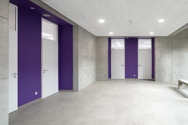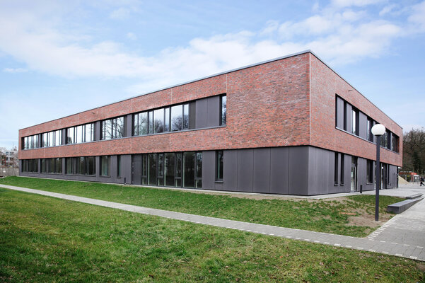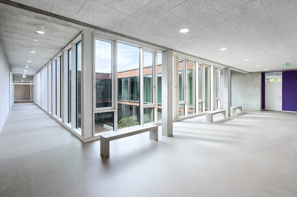 Bestehend aus dem kernsanierten Altbau, der Turnhalle und dem Hausmeisterhaus ergänzt der zweigeschossige Neubau das Ensemble und schafft eine zentrale Pausen- und Begegnungsfläche. Vermittelnd zwischen alter Hallenfassade und neu interpretierter Hülle des Hauptbaus, fügt sich der neue Atriumsbau mit verkehrter Anordnung des allgegenwärtigen Klinkers, spielend ins Gesamtgefüge ein. Vom Farbleitkonzept geprägte Klassenräume umgeben die Mehrzweckbereiche und Flure in Mauerwerk und Sichtbeton.