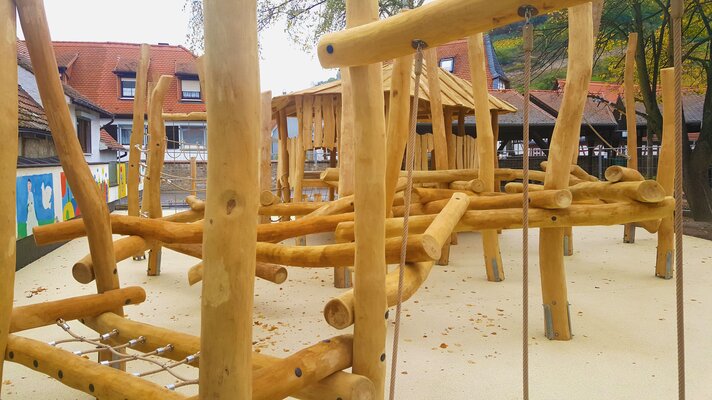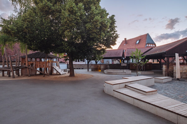 Inmitten der historischen Altstadt von Heppenheim liegt eingekreist von Fachwerkbauten und alten Mauern die Schlossschule. Auf einer relativ kleinen Fläche von rund 1000 m², ist eine spannende und attraktive Spiel- und Erholungslandschaft für SchülerInnen und Lehrpersonal entstanden. Eine Großzügige Kletteranlage mit Baumstammmikado sowie ein Baumhaus bilden den Spielbereich. Bereiche aus Natursteinpflaster mit Sitz- und Liegepodesten ausgestattet, definieren Ruhezonen.