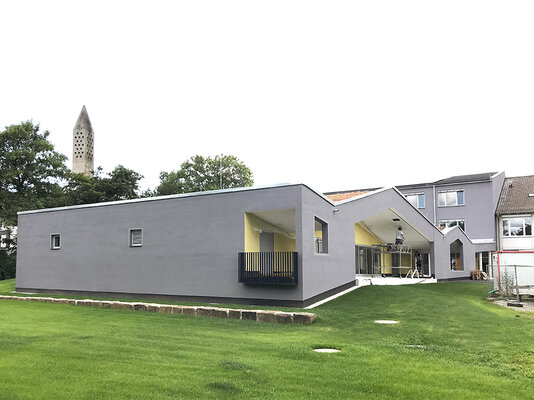 Die Grundschule wurde für Räume des Ganztagsbetriebs nach Süden verlängert, hofseitig eine Mensa vorgelagert. Spielflächen fließen zwischen den Gebäuden hindurch. Das gefaltete Gründach überdeckt Mensa und Arkade, über die der Eingang zum Ganztagsbereich an der Fuge zw. neu und