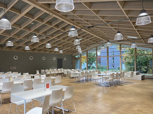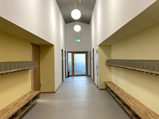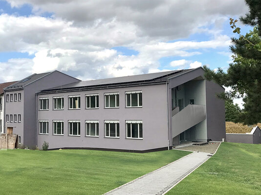 alt angebunden ist. Zellulosegefülltes Ziegelmauerwerk, Holzfenster und sichtbare Holzdachkonstruktion. Fernwärme und PV-Anlage versorgen das Gebäude mit Wärme und Strom. Ein Aufzug sichert die barrierefreie Erschließung.