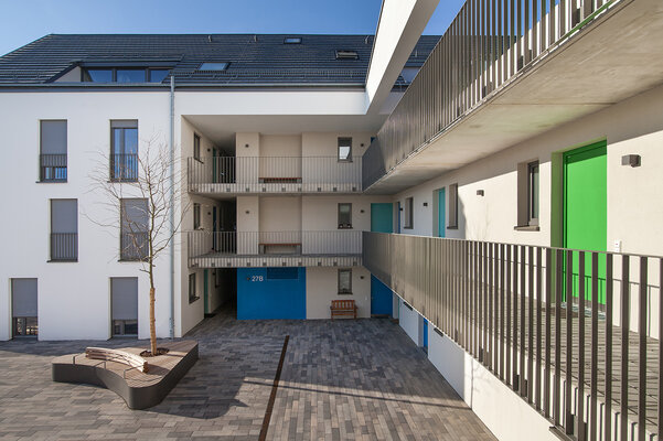 Die Seniorenwohnanlage mit 36 Wohnungen ist die bauliche Antwort auf den Wunsch, im Alter selbstständig wohnen und dennoch Unterstützung nach individuellem Bedarf in Anspruch nehmen zu können. Entwurfsmotiv für die Gestaltung sind die den offenen Erschließungsgängen zugeordneten ge-meinschaftlichen Hof- und Grünflächen, welche die drei Häuser miteinander verbinden. Ein Wohncafé/Pflegedienst am offenen Eingangshof, drei Dach-gärten und ein gemeinschaftlicher Gartenhof dienen als Treffpunkt für alle.