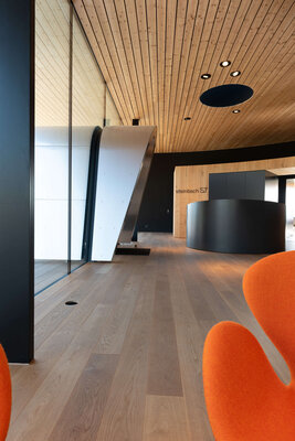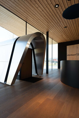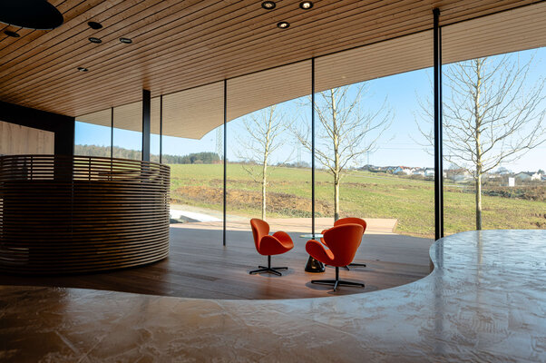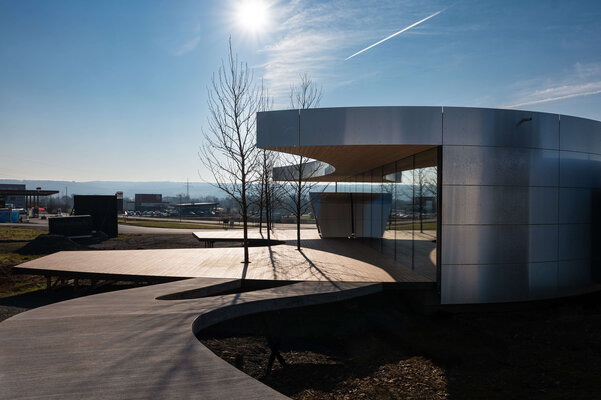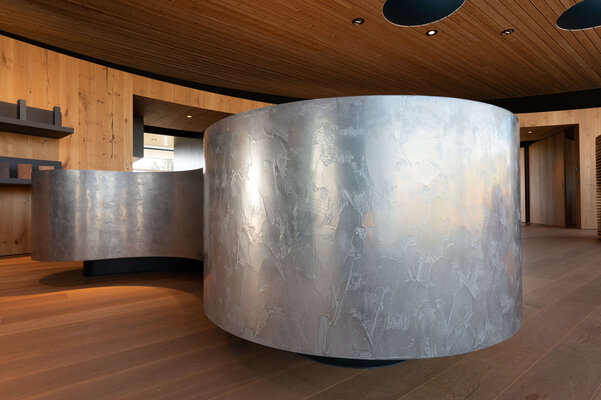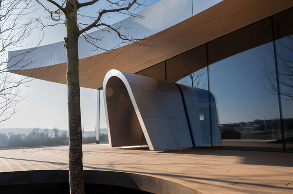 Architektur als lebendiger Organismus. Fließende Formen und kraftvolle Geometrien öffnen die Ausstellungshalle einladend den Besuchern. Eine vier Meter hohe Glasfassade mit fast unsichtbaren Fugen lässt Innen und Außen verschmelzen. Bäume wachsen durch die Terrasse, spenden Schatten und schaffen ein lebendiges Spiel aus Licht und Natur. Holz, Glas und skulpturale Elemente formen einen Innenraum von besonderer räumlicher und emotionaler Intensität.