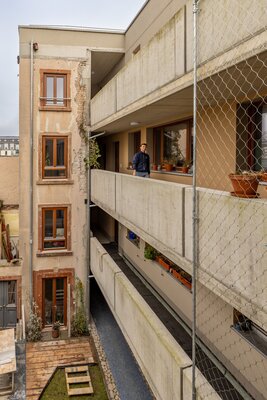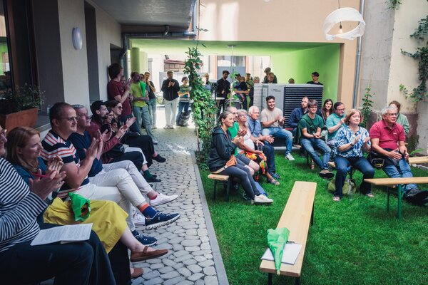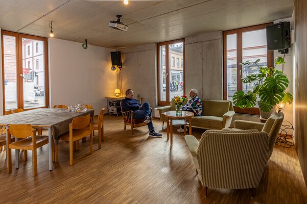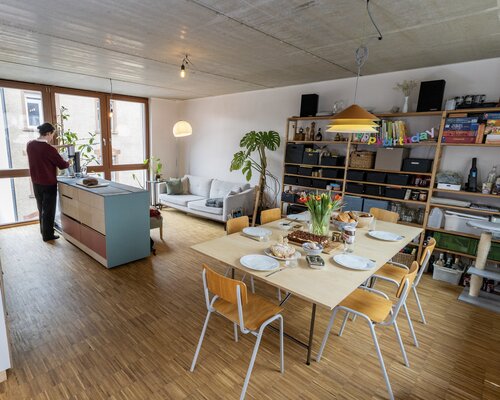 Der Bestandsbau wurde zur Hälfte zurückgebaut und als künstliche Ruine erhalten, um das unbeheizte Treppenhaus mit Aufzug aufzunehmen. Der viergeschossige Neubau mit fünf Clusterwohnungen ermöglicht flexible 1- bis 6-Zimmer-Wohnungen. Ein Gründach mit Photovoltaik und Regen- rückhaltung leistet einen aktiven Beitrag zur Schwammstadt. Mit nur 30 Quadratmetern pro Person fördert das Projekt suffizientes Wohnen, solidarisch geteilte Nutzungen und einen gemeinschaftlich intensiv genutzten Raum für das Quartier.