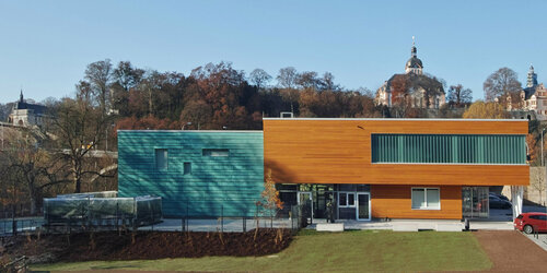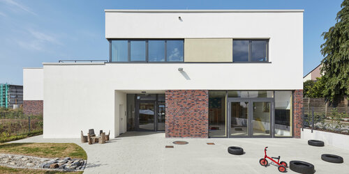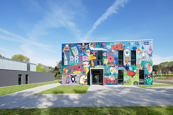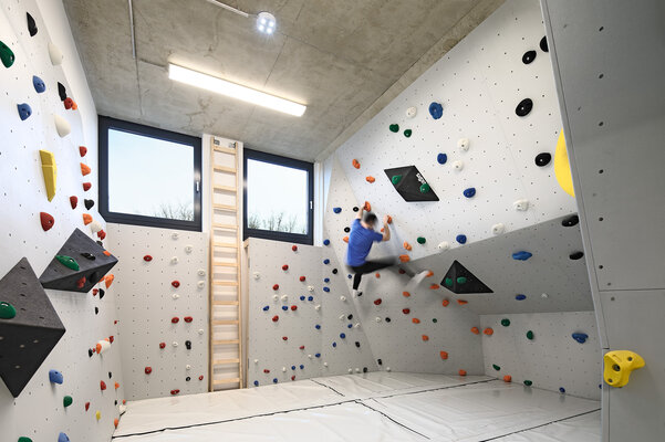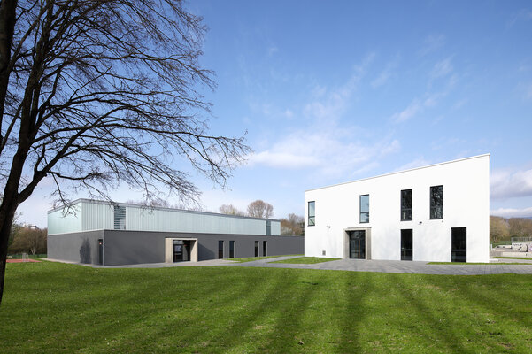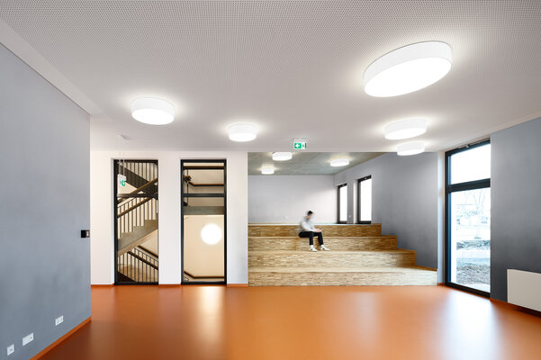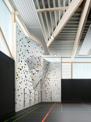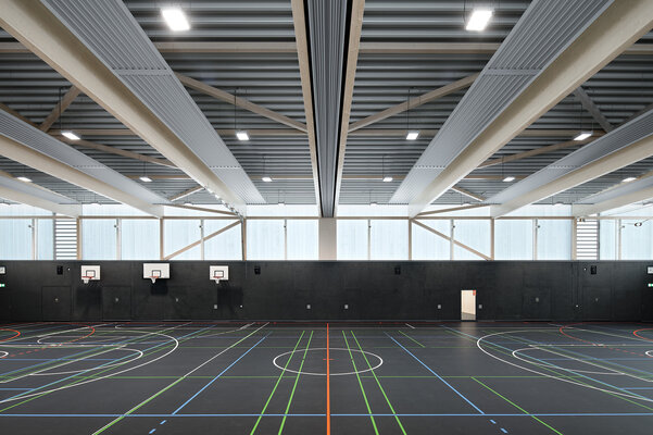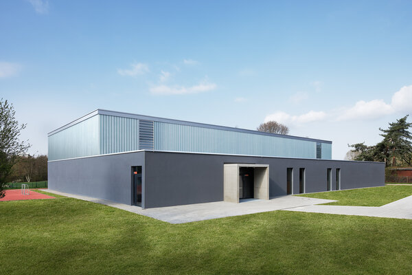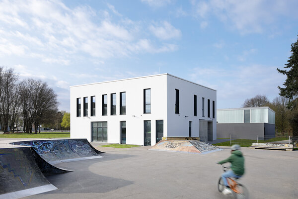 Zwei im Nordwesten des Grundstücks angeordnete Neubauten schaffen gemeinsam mit dem Bestand eine klar definierte Platzsituation. Die Sporthalle ergänzt ein eingeschossiger Gebäudeteil, der einerseits für eine klare optische Trennung zwischen den Bauvolumen von Sporthalle und dem mehrgeschossigen Jugendzentrum sorgt, der aber gleichzeitig eine Verbindung schafft. Die Nutzungen der angrenzenden Freibereiche können so außerdem gut zugeordnet werden, ein Vorplatz verbindet aber beide Gebäude.