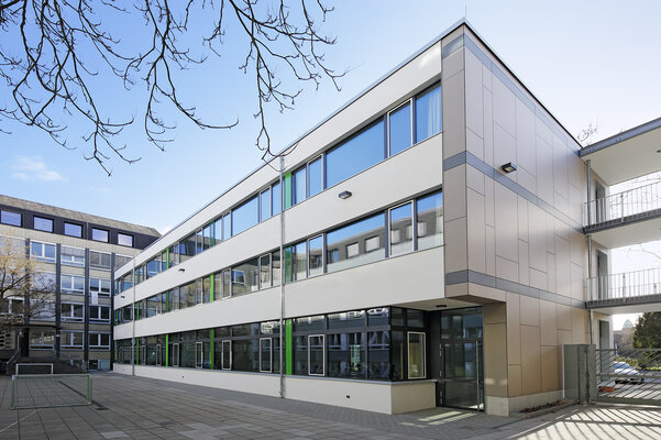 Das 3-geschossige Schulhaus mit 14 Klassenräumen in stadträumlich prägnanter Lage ist als „Spange“ in Front eines Ensembles aus 4 bestehenden Gebäuden konzipiert. Eine Stadtloggia ermöglicht in den Pausen Sichtbezug zum Stadtleben und definiert den bestehenden Eingang neu. Die stadtseitige Fassade folgt dem gekrümmten Straßenverlauf. „Schaufenster“ erlauben Einblicke in das Schul-Geschehen und setzen Akzente in den Fluren. Sichtbetonwände, verglaste Schulraumtüren aus Eiche prägen die Innenräume.