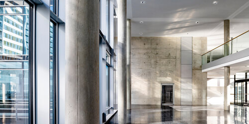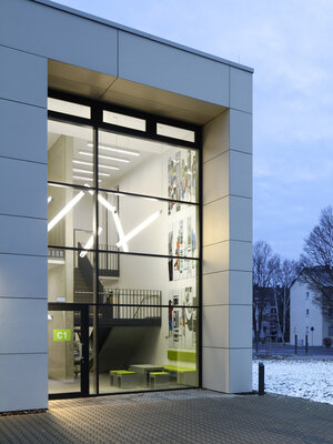 Der puristische, singulär wirkende Bau mit physikalisch-technischen Prüflaboren, Seminar- und Büroräumen ist Auftakt des künftigen Technologiezentrums der THM in Friedberg. Die reduzierte, technisch anmutende Architektursprache in hellem Faserzement, Sichtbeton und kräftigen Farbakzenten spiegelt die Bestimmung des Hauses als Ort von Forschung und Lehre. Das lichtdurchflutete Treppenhaus mit expressiver Leuchtenskulptur lädt mit Verweilnischen ein zu Kommunikation und fachlichem Austausch.