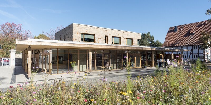 Im Tierpark Sababurg wird mit einem neuen Empfangsgebäude auf jährlich wachsende Besucherzahlen reagiert und eine, für diesen besonderen Ort, angemessene Eingangssituation geschaffen. Durch die vorherrschend regionalen Materialen Holz und Sandstein fügt sich das Gebäude zurückhaltend in die historische Anlage ein. Das Flugdach wird von geschälten Eichenstämmen aus dem Reinhardswald getragen. Ein Imbiss im Westen komplettiert mit seinem terrassiert gestalteten Außengelände den Ausgangsbereich.