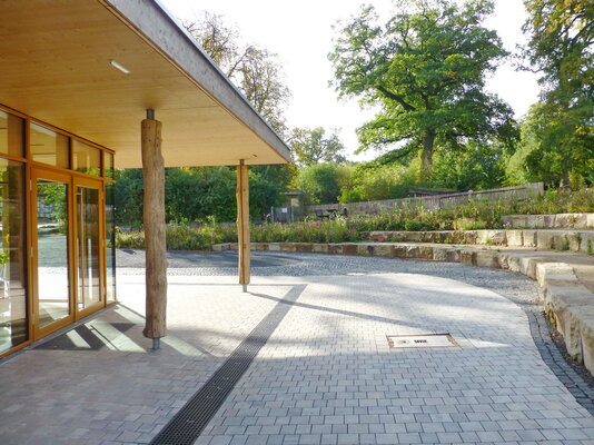 Der Eingang mit Pavillon und Kiosk wird neu gestaltet. Die Schwierigkeit an der Aufgabe war, die Höhensituation in dem stark bewegten Gelände zu meistern und eine überzeugende Verbindung zwischen Eingangspavillon und höher gelegenem Kiosk zu schaffen. Eine geschwungene Sitzstufenanlage reagiert auf die starke Geländesituation zwischen beiden Baukörpern. Die weiteren feinen Modellierungen mit den notwendigen Wegeverbindungen passen sich wie selbstverständlich in die Parklandschaft ein.