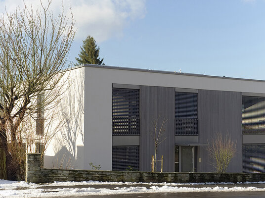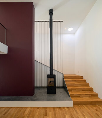 Die Überformung des 1960er-Jahre-Hauses ermöglicht die energieoptimierte Nutzung durch eine große Familie. Die neue Gestaltung präsentiert mit groß-flächigen Fensteröffnungen, gliedernden Holzverkleidungen und erneuertem Balkon ein modernes Erscheinungsbild. Im Innern zeigt sich das Haus lichtdurch-flutet mit fließenden Räumen als luftiges Heim. Solarkollektoren unterstützen eine Holzpelletheizung, sorgen für behagliche Wärme im gesamten Haus und beheizen zur Sommerzeit einen bestehenden Außenpool.