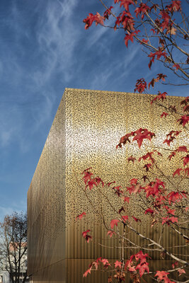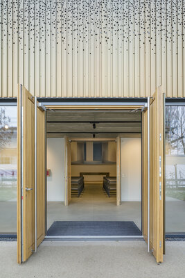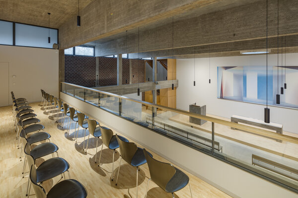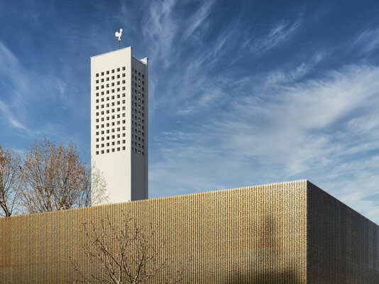 Im Zuge einer erforderlich gewordenen Reduzierung der baulichen Anlagen wurde das im Jahr 1963 errichtete evangelische Gebäudeensemble bis auf den Nukleus, den Kirchsaal, rückgebaut. Die innere Raumhülle des Saals blieb in ihrem Charakter weitestgehend erhalten, ein lichtdurchflutetes Foyer in axialer Ausrichtung zum Altar sowie Funktionsräume wurden ergänzt. Die Außenfassade aus profiliertem, perforiertem Edelstahl dokumentiert die Transformation des Gebäudes und hebt es als Sakralbau hervor.