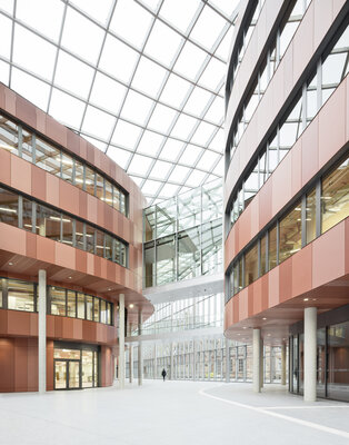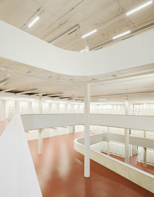 Der zweifach abgeknickte Riegel des Neubaus wird unterteiltdurch das über die gesamte Gebäudehöhe offene, verglasteAtrium. Dieses öffnet sich nach Norden Richtung Elisabethkirche, im Süden zum Alten Botanischen Garten. Innerhalb der Bibliothek wird das für Marburg charakteristische Themavon Topografie und Höhenabtreppungen aufgegriffen. Die kaskadenförmig ausgeformte Haupttreppe führt den Besucher in die verschiedenen Ebenen. Ge-staffelte Leseterrassen machen die Bibliotheksniveaus erlebbar.