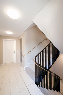Auf einem ehemaligen Garagenhof einer Zeilenbausiedlung aus den 60ern bietet das Mehrfamilienhaus 20 zumTeil barrierefreie Wohnungen mit Aufzug. Das L-förmige Gebäude bildet mit seiner plastischen Kammputzfassade und rhythmisch angeordneten Balkonen an der Straßenecke einen modernen und urbanen 5-geschossigen Kopf mit markanter Verglasung. Die Wohnungen sind im Osten zu einem Freibereich mit Laubengängen erschlossen und bilden den Auftakt einer zukünftigen Nachver-dichtung zu einem U-förmigen Hof.