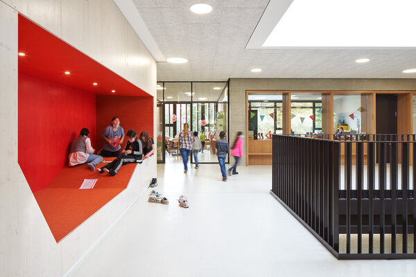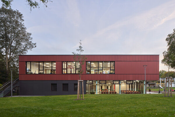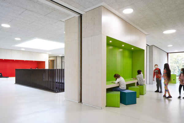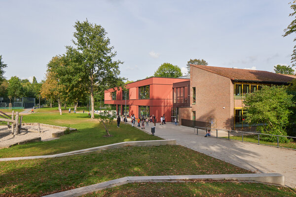 Der Grundschulbereich wird mit einem Neubau zur Ganztagsschule erweitert. In dem clusterartigen Grundriss entstehen vielfach nutzbare Flächen, Nischen und Zwischenräume, die für einen flexibel gestaltbaren Unterricht und die Nachmittagsbetreuung nutzbar sind. Im EG befinden sich eine Mensa mit 200 Sitzplätzen sowie ein Bewegungsraum, der für große Veranstaltungen zur Mensa hin geöffnet werden kann. Oberlichter und Deckenöffnungen sorgen für eine natürliche Belichtung in beiden Geschossen.
