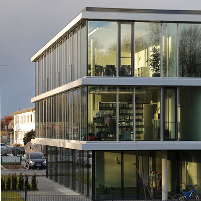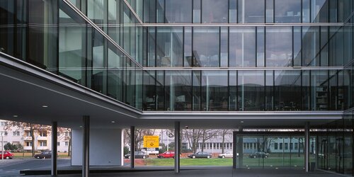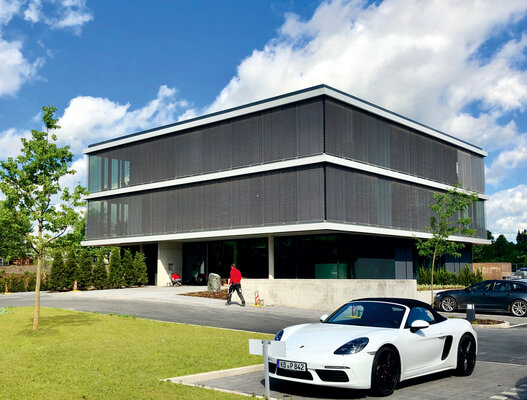 Die Büros des neuen quadratischen Verwaltungsgebäudes sind mit bodentief verglaster Fassade um einen massiven Funktionskern angeordnet.