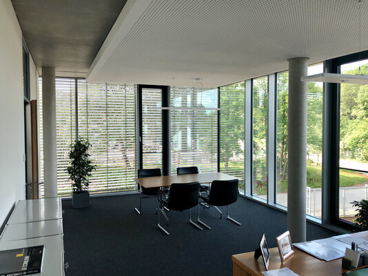 Akustiksegel unter den Sichtbetondecken reflektieren das Licht der Pendelleuchten, Raffstore-Anlagen ermöglichen individuellen Sicht- und Sonnenschutz.