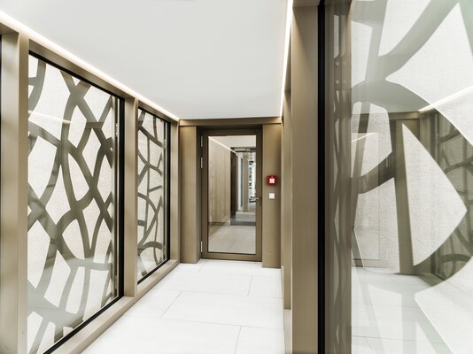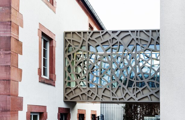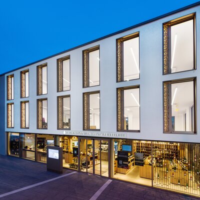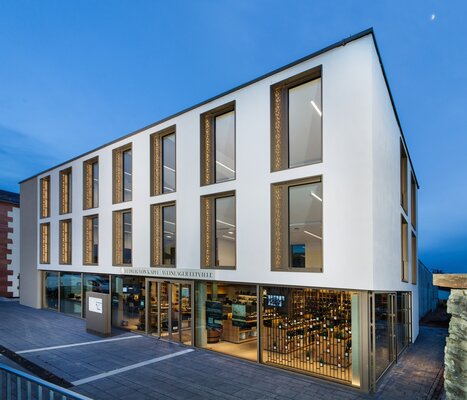Der klar gegliederte Kubus fügt sich neben dem historischen Gebäude ein, ohne Konkurrenz zu sein. Proportion und Stilmittel wurden in eine zeitgemäße Architektur übertragen. Fassadenelemente mit stilisierten Weinreben schaffen eine Verbindung zum Standort und Bauherrn. Die städtebauliche Orientierung fördert den Wunsch einer zukünftigen Platzgestaltung. Das Gebäude ist barrierefrei und verfügt über ein zeitgemäßes energetisches Konzept (Betonkernaktivierung).