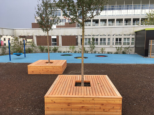Auf der Dachfläche eines neuen Supermarktes entstand eine Kindertagesstätte mit großzügigem, intensiv bepflanztem Freiraum.