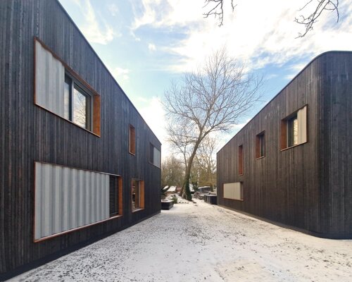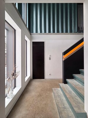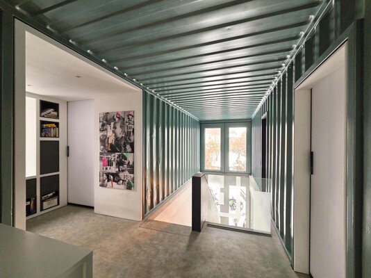 Gebrauchte Seecontainer erhielten ein zweites Leben als Tragwerk eines hybriden Systems mit Holzdach und Holzfassade. Containersegmente fanden Wiederverwendung, die Konstruktion bleibt partiell erlebbar. Der re:use-Gedanke und ein konsequenter Materialkanon mit hohem Detailanspruch verbinden Ressourcenschonung mit architektonischer Qualität. Die gedrehte Setzung der Baukörper sichert Baumerhalt, optimale Grundstücksnutzung und vermittelt zwischen Infrastrukturraum und Wohnnutzung.