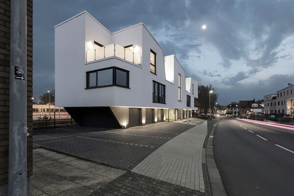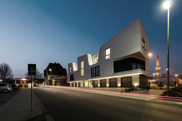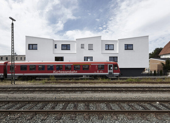Eigentlich galt das schmal geformte Grundstück zwischen einer Straße und dem Gleisfeld in Korbach als schwer bebaubar. Lediglich ein paar Garagen sollten entstehen. Der Bauherr konnte jedoch davon überzeugt werden, noch zwei weitere Geschosse zu realisieren. Das Gebäude beherbergt daher in den beiden Obergeschossen eine psychiatrische Ambulanz für Kinder und Jugendliche der Vitos Kurhessen gem. GmbH und schafft durch seine markante Form einen lebendigen Ort in der Nachbarschaft.