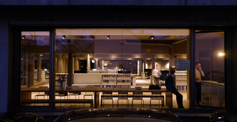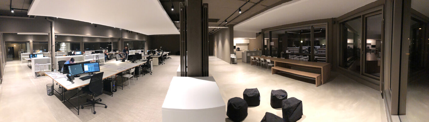 grabowski.spork hat sich einen Supermarkt zum Multispace-Büro umgebaut: Ein offener Raum mit über 400 qm macht das Arbeiten zum Erlebnis. Vier überdimensionale Arbeitsinseln jeweils mit bis zu sechs Arbeitsplätzen sorgen für luftige, kreative Teamarbeit. Im „Schaufenster“ steht ein 6 Meter langer Eichentisch mit angeschlossener offener Küche – die Team-Lounge. Raumhohe Glaswände trennen Besprechungsräume und Rückzugsbereiche ab. Brauntöne kontrastieren mit weißen Möbeln und erzeugen ein edles Ambiente.