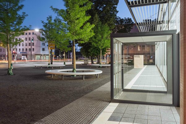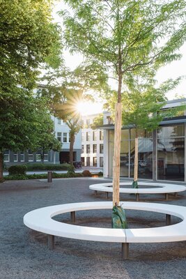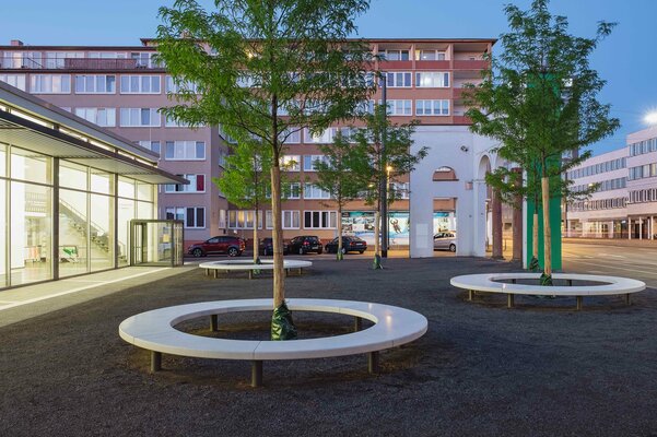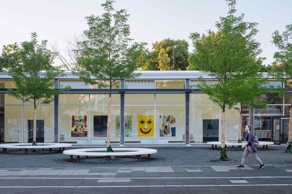 Die minimalistische Architektursprache der Kunsthalle findet im neu gestalteten Vorplatz ihre Erwiderung. Die pavillonartige und lichtdurchflutete Architektur steht im „fließenden Raum“ eines städtischen Grünraumes. Innen- und Außenraum der transparenten Architektur verschmelzen. Ein lichter Baumhain aus sieben neu gepflanzten Gleditschien schafft einen atmosphärischen Freiraum vor der Kunsthalle. Als Merkzeichen prägen drei Rundbänke den neu geschaffenen urbanen Aufenthaltsort.