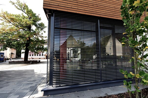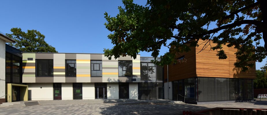 Die Erweiterung der Grundschule besteht aus drei Baukörpern, verbunden über zwei verglaste Treppenhäuser, die direkt an den Bestand anschließen. Der zweigeschossige Neubau mit begrüntem Flachdach beherbergt Räume für Musik, Werken, Computer, Bewegung und Verwaltung, Bibliothek und Mensa. Das Gebäude ist barrierefrei und enthält Passivhauskomponenten. Durch große Öffnungen in der Fassade gelangt viel Tageslicht ins Innere, wodurch eine hohe Aufenthaltsqualität und angenehme Lernatmosphäre entsteht