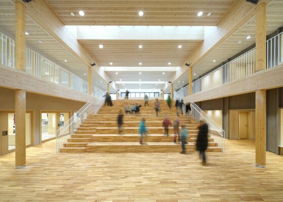 Die Wilhelm-Arnoul-Schule wurde nicht nur um zusätzliche Klassenräume, Mensa, Aula und Ganztagsbereiche erweitert, sondern barrierefrei mit modernen Jahrgangsclustern fünfzügig ausgebaut. Der Bestandsbau von 1962 wurde renoviert und umgebaut und an der Ostseite um einen annährend gleich großen Neubau in klimaneutraler Holzrahmenbauweise ergänzt. Zwischen den beiden Gebäuden vermittelt eine neue, ebenfalls in Holzbau errichtete Halle, die den Eingang markiert und das Herz der Schule bildet.