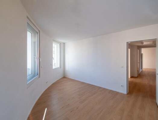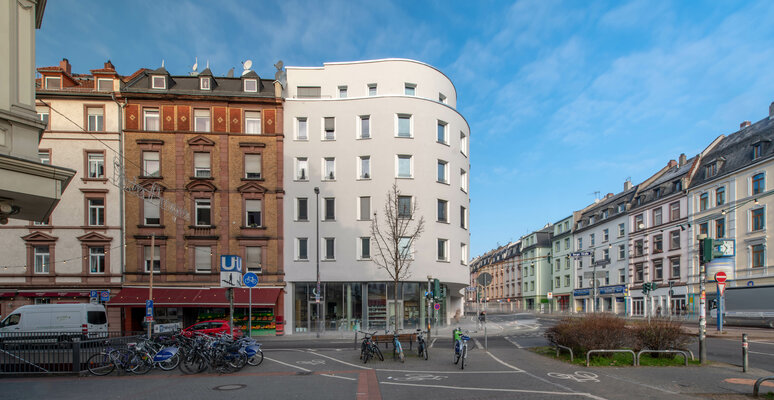 Das Wohn- und Geschäftshaus mit 19 Wohnungen und 2 Geschäften im Ergeschoss ist im Passivhausstandard errichtet. Der Neubau schließt die Baulücke an der stark befahrenen Kreuzung. Die Wohnräume liegen nach Westen zum Innenhof. Sie haben große Balkone bzw. Loggien. Die Läden in der Erdge-schosszone sind zurückgesetzt und verglast. Das 5. Obergeschoss springt ebenfalls zurück und vermittelt zwischen den geneigten Dächern der Nach-barhäuser.