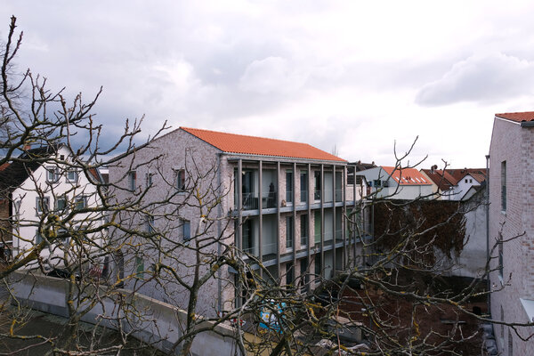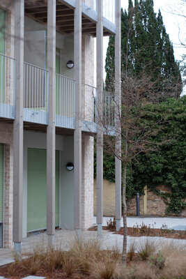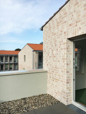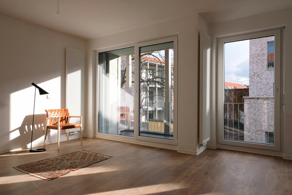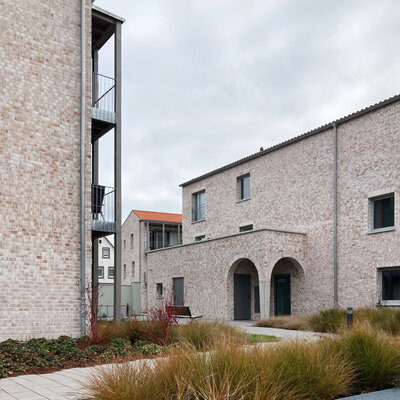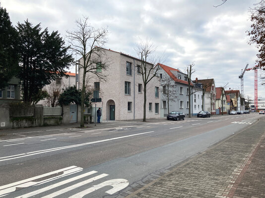 Im Rahmen einer innerstädtischen Nachverdichtung entstand auf dem Areal zwischen der Frankfurter- und der Taunusstraße eine Bebauung aus sechs Baukörpern mit 45 Wohnungen. Körnung und Materialität orientieren sich an den bestehenden Strukturen, vor allem an den Hofreiten entlang der Frankfurter Straße. Hell geschlämmte Klinkerfassaden prägen die zusammenstehenden Häuser. Nach Süden öffnen sich die Gebäude großflächig zu den vorgestellten Holzbalkonen, welche als Brise Soleil Schatten spenden.