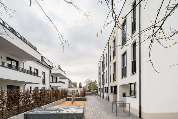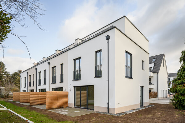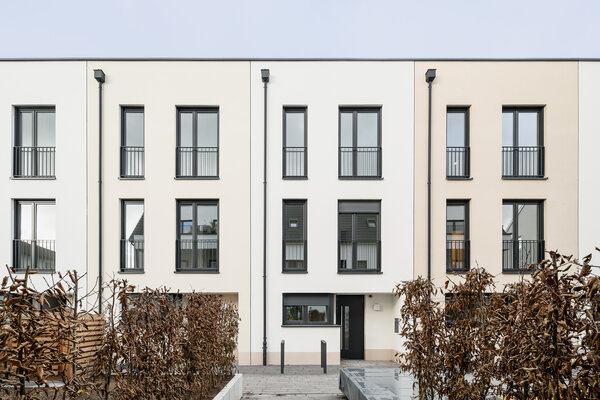 Wohnen für Familien – ein Spielhof verbindet ein Mehrfamilienhaus und fünf Reihenhäuser. Zentral gelegen im Grünen „Reiterdorf”– Frankfurt-Seckbach sind fünf Reihenhäuser und sechs Mietwohnungen gebaut. Architektonisch im Erscheinungsbild der Moderne verpflichtet. Alle Wohnungen haben Garten, Hof, Dachterrasse, Garten oder Balkon. Geparkt wird in einer gemeinsamen Tiefgarage. Barrierefreie direkte Zugänge in die Reihen- häuser und Wohnungen via Aufzug. Energetisch mit Blockheizkraft, optimaler Dämmung und begrünten Flachdächern.