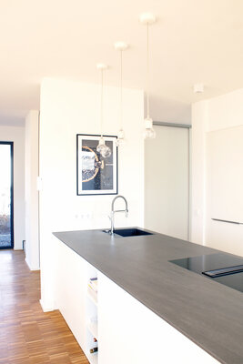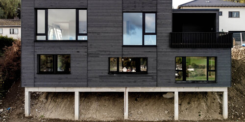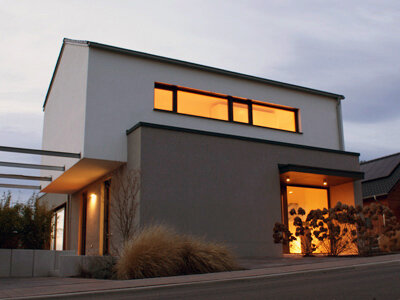 Zwei versetzt und übereinander gestapelte Baukörper definieren den reduzierten und klaren Entwurfsansatz. Auch das Gebäudeinnere ist klar strukturiert. Wohnbereich im EG und der, über eine Sichtbetontreppe, angebundene Privatbereich im OG. Das Eingangselement mit seinem großen "Schaufenster" bietet eine Art Ausstellungsfläche.