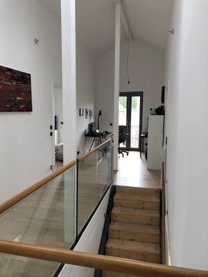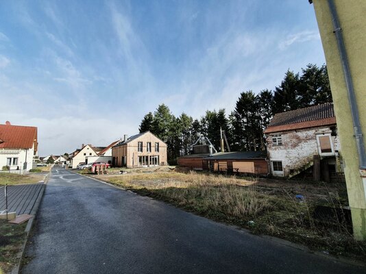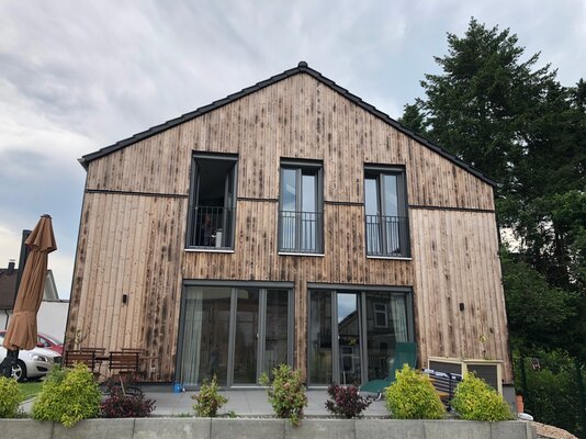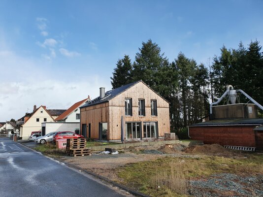 Die noch in Betrieb stehende Schreinerei und der bewaldete Bereich hinter dem Haus bieten eine Kulisse mit welcher das Haus durch die naturbelassene Holz-Fassadenverkleidung regelrecht verschmilzt.